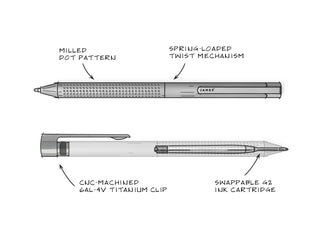 The Bolen is our first twist-retractable pen. Its two-handed twist action ensures it will never deploy by accident on your desk or, worse, in your pocket. Featuring a precision-machined barrel with a thinner, more ergonomic diameter, along with a machined pocket clip, the Bolen complements any desktop or pocket. Twist pens are revered for their smooth and silent operation (compared to the familiar “click” of click pens), offering a more refined way to interact with your daily writing instrument. The Bolen’s lightweight durability and satisfying twist action make it hard to put down. It comes with a black Parker-style G2 ink refill for an ultra-smooth writing experience. This also means you can easily customize your Bolen, as these refills are widely available in a variety of ink colors and line sizes.